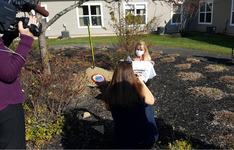 Residents and staff from The Terrace at Eddy Hawthorne Ridge assisted living residence brainstormed and collected symbolic items for the capsule. The items buried included a thermometer, wipes, sanitizer, a 6-foot tape measure (for proper social distancing), toilet paper, a “HawthorneStrong” hat and t-shirt, photos, a newspaper with a COVID-19 headline, a poem about the pandemic times, and a thumb drive with a music video chronicling the strength that residents and staff have shown.