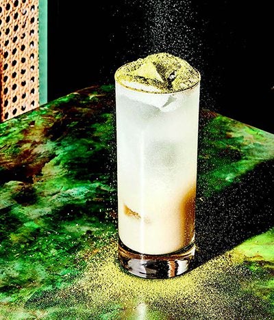 Stir together tea, coconut milk, and lime juice. Pour into two glasses filled with ice and top with seltzer. Dust with matcha powder.