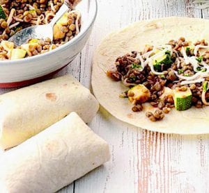 - Stir zucchini, taco sauce and cheese into lentils. To serve, place about 1/2 cup lentil mixture on each tortilla and roll up.