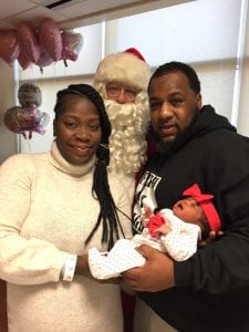 December 26, 2019After a long night of making deliveries, Santa made one last stop at St. Peter’s Hospital on Christmas Day before heading back to the North Pole. Old St. Nick visited happy moms and families – and brought a gift for their newest arrivals – in their hospital rooms at the St. Peter’s Hospital Hearst Family Center. Santa stopped in to see Gabriel Surgick, who was born earlier that morning on Christmas Day, as well as Parker Morales (born on Christmas Eve), and Briale Dunn (born December 23).