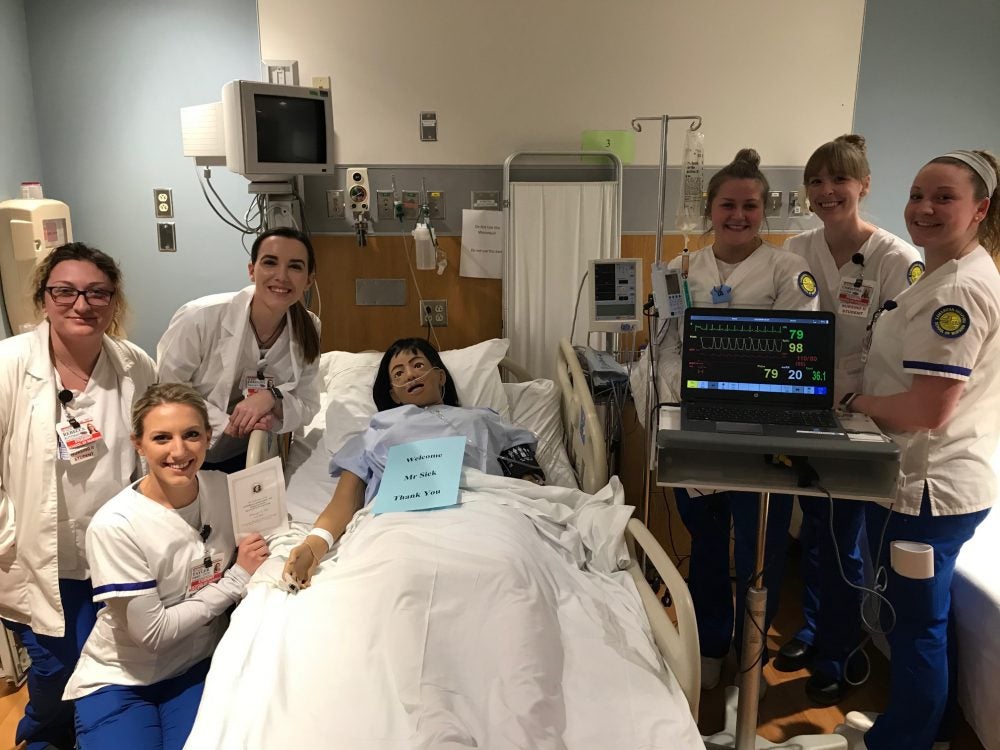 The Andrea Siek, R.N., Simulation Education Center features technologically sophisticated mannequins that replicate real patients. Among other capabilities, the mannequins have heartbeats and breath sounds that allow students to practice a variety of tasks, including starting IVs and wound care.