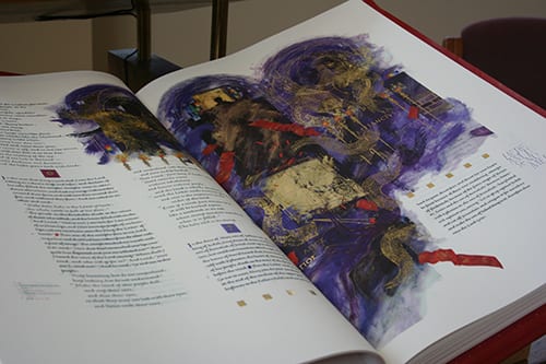 The books are a limited edition, museum-quality work of art and biblical scholarship – one of only 299 sets in the world. They were commissioned by the monks at St. John’s Abbey in Collegeville, MN, in 1998 and completed in 2011. A team of scribes and artists overseen by renowned calligrapher Donald Jackson in Wales worked for more than a decade to complete this masterpiece; no project of its kind has been undertaken since the advent of the printing press in the 15th century.
