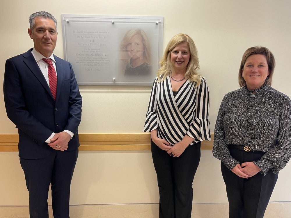 In recognition of this momentous event, leaders from St. Peter’s Health Partners (SPHP), including president and CEO, Dr. Steven Hanks, formally recognized the team from SPHP’s Monoclonal Antibody Clinic at the Albany Memorial Campus of Samaritan Hospital. The recognition included the dedication of a plaque honoring clinic leader Dr. Melissa Fiorini and her staff for the critical role they played in the delivery of life-saving treatment to patients.
