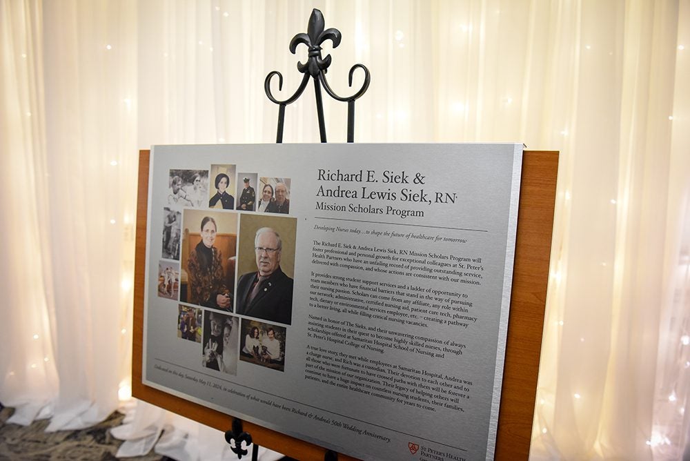 At a special gathering on Saturday, May 11, at the Franklin Terrace Ballroom in Troy, local philanthropist Richard Siek announced he was making a more than $1 million donation to St. Peter’s Health Partners’ (SPHP) Mission Scholars Program in memory of his late wife, Andrea Lewis Siek, RN. The announcement was followed by an unveiling ceremony, where the Mission Scholars Program was renamed the Richard E. Siek & Andrea Lewis Siek, RN Mission Scholars Program.